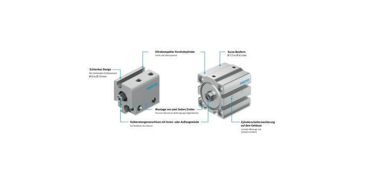 Beide Kompaktzylinder stehen in durchgängigen Baugrößen mit Kolbendurchmessern von 6 bis 63 Millimetern zur Verfügung. Als Teil unseres Kernprogramms (im digitalen Katalog mit einem Stern gekennzeichnet), sind sie zudem weltweit einheitlich und besonders rasch verfügbar. Er ist also die perfekte Lösung – auch für Maschinen, die ans andere Ende der Welt exportiert werden.